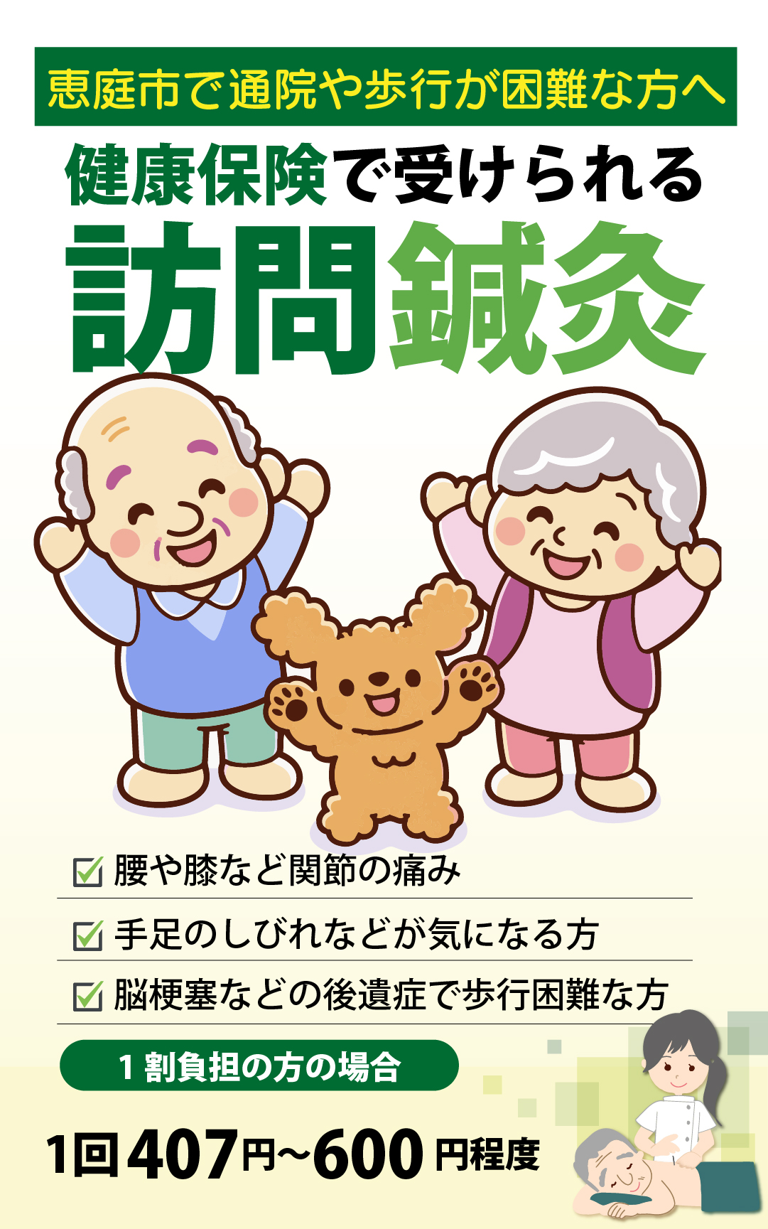 医師の同意書があれば健康保険を利用して訪問鍼灸を受けることができます。往療料込みで1割負担であれば407円~600円程度のご負担で利用することが可能です。